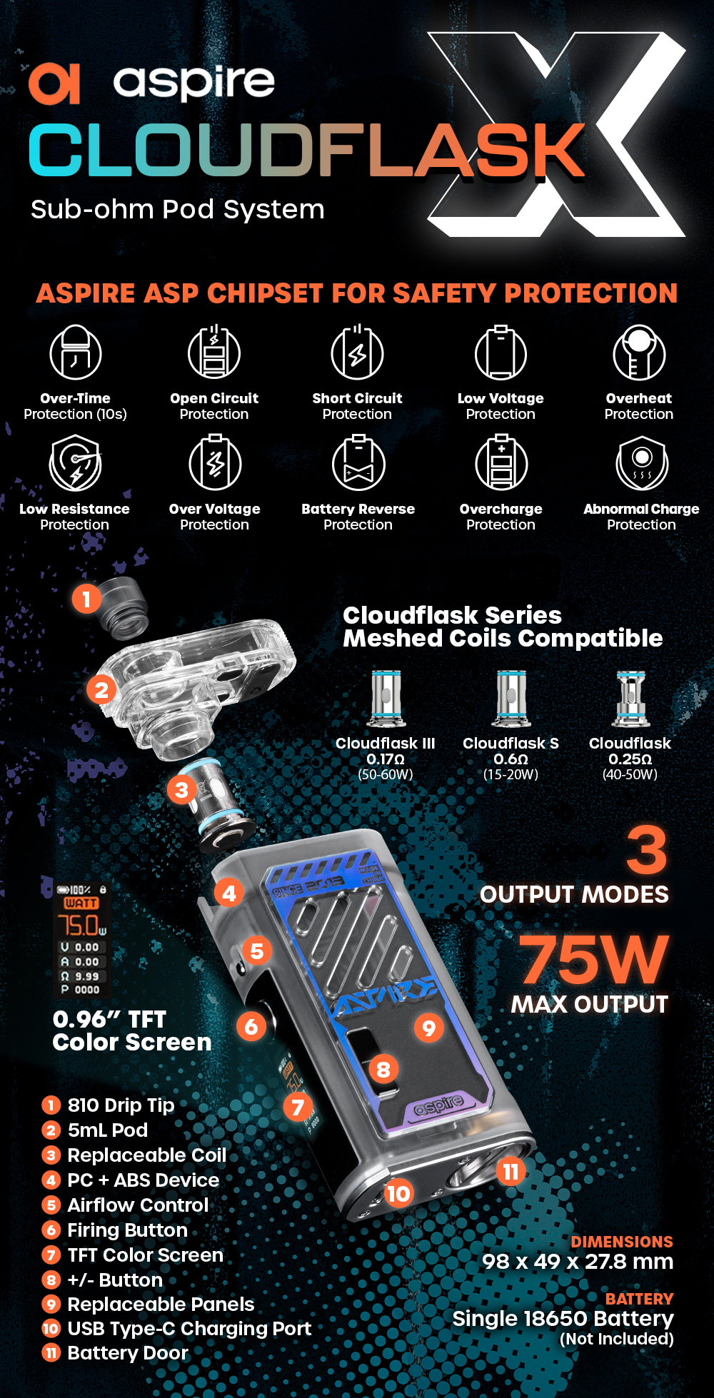 ASPIRE CLOUDFLASK X 75W POD SYSTEM FEATURES: