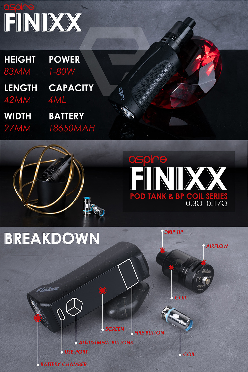 Check out the Aspire FINIXX 80W Starter Kit, featuring a 1-80W range, extensive temperature control system, and is equipped with a 4mL BP Coil Pod Tank. Constructed from durable zinc-alloy, the chassis of the FINIXX Starter Kit offers a relatively resistant form factor. Ergonomically constructed, the FINIXX fits neatly in the hand and offers a soft-touch for an improved hand-feel. Powered by a single high-amp 18650 battery, not included, offers a wattage range of 1-80W, and features full protections with the ASP Chipset. In addition, the Aspire FINIXX offers a full range of temperature control options, granting the user the ability to control the desired output from any rebuildable option threaded at the top. Coming with a factory FINIXX Pod Tank, the Aspire FINIXX Starter Kit can hold up to 4mL of eJuice or nicotine salts and utilizes the BP Coil Series. With a 0.6ohm and 0.17ohm mesh coil option, these coils can take the true flavor from your favorite eJuice or nicotine salt.