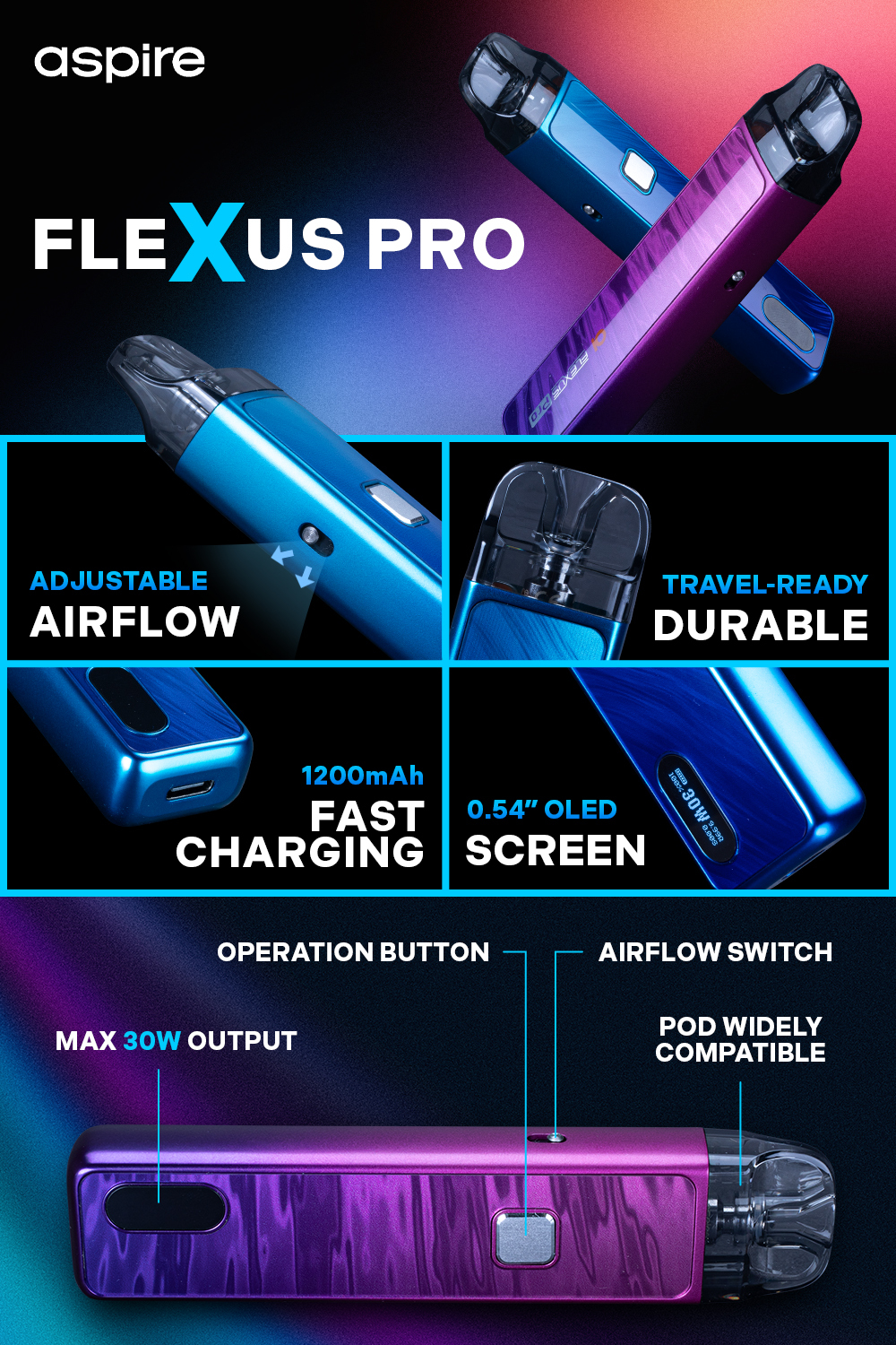 ASPIRE FLEXUS PRO 30W POD SYSTEM FEATURES: