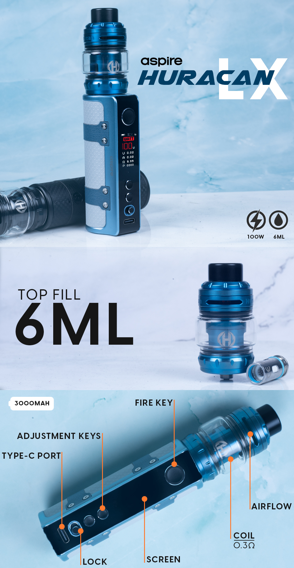 Experience the Aspire Huracan LX Starter Kit, featuring adjustable wattage from 5-100W, adjustable voltage from 0.55-0.9V, temperature control 200-600ºF, bypass mode, a 3000mAh internal battery, 6mL tank capacity, a 0.96" TFT color display, adjustable airflow, and compatibility with BP series coils.