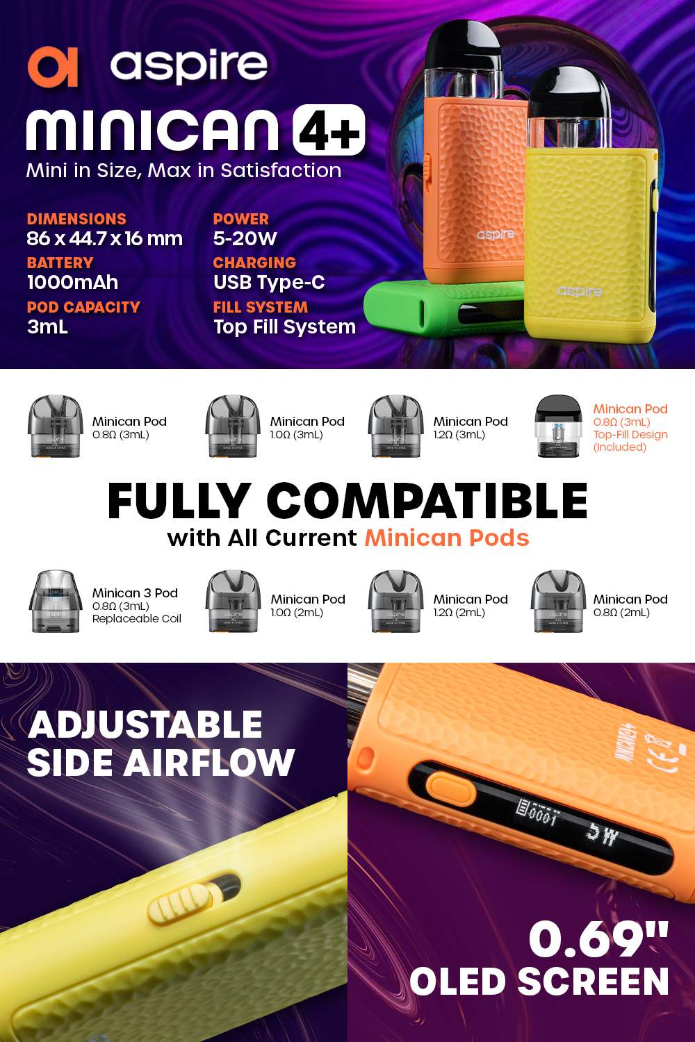 Check out the Aspire Minican 4+ 20W Pod System, featuring a 5-20W output range, PC + ABS chassis construction, and holds 3mL within the top-filled Minican Pods.