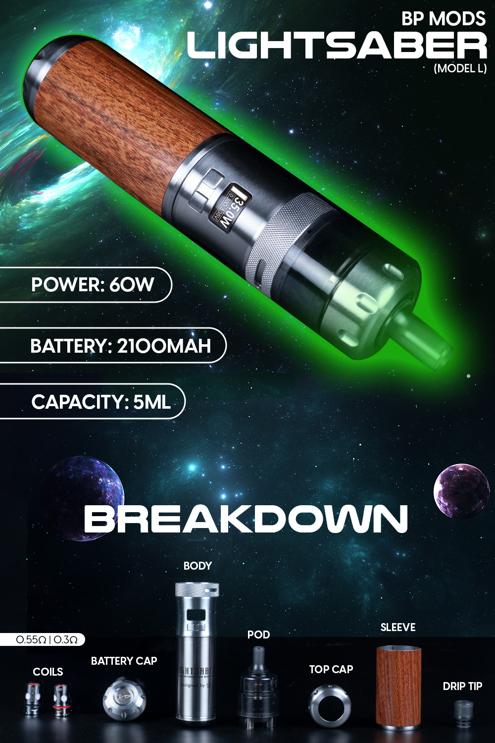 Shop the BP Mods x DOVPO Lightsaber Pod Mod Kit Model.L, featuring a 2100mAh internal battery, 5mL pod capacity, wooden sleeves, and adjustable wattage from 5-60W. With multi-coil series support, the Lightsaber is compatible with TMD, TMD Mesh, TMD Pro, VOOPOO PnP, and Vaporess GTX coil series. Additionally, a high-quality wooden sleeve is included with each kit, which features a Phoebe Zhennan wood sleeve for the Gunmetal colorway and a Bubinga Wood Sleeve for the Stainless Steel option.