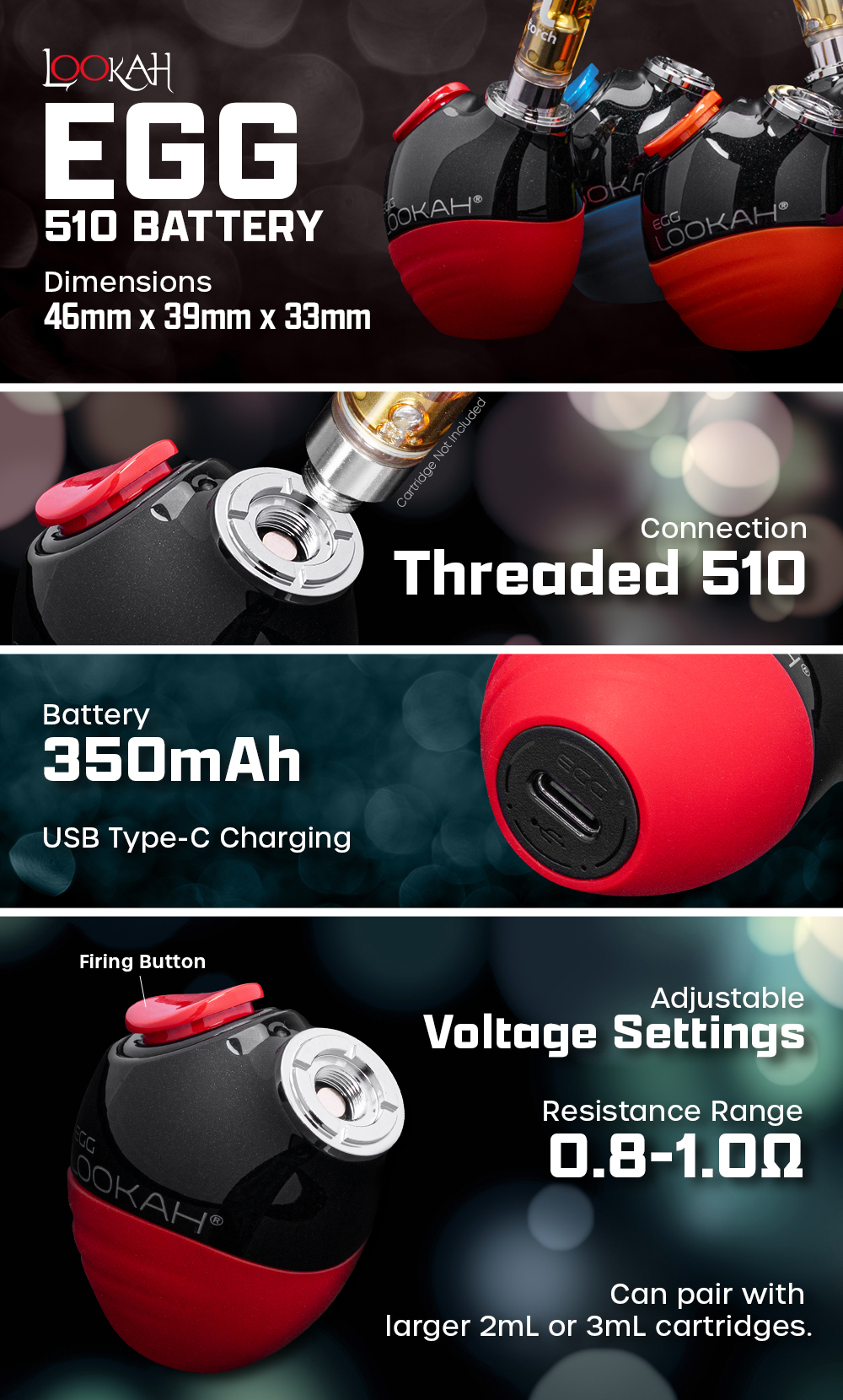 LOOKAH EGG CARTRIDGE 510 BATTERY FEATURES: