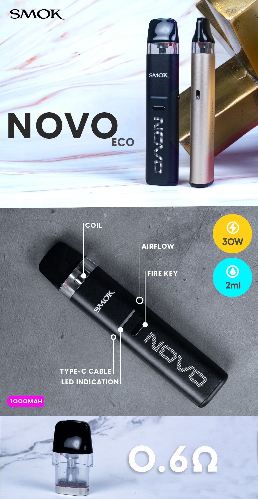 Check out the SMOK NOVO ECO 30W Pod Kit, featuring a 1000mAh battery, 30W output maximum, and offers a hard or soft mode switch for stronger output.
